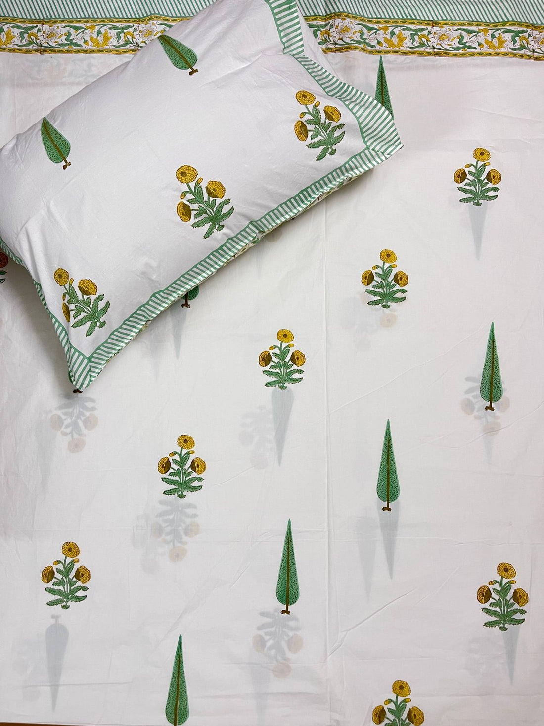 Hand Block Printed Quilted Bed Cover (Green Leaves Yellow Flowers)
