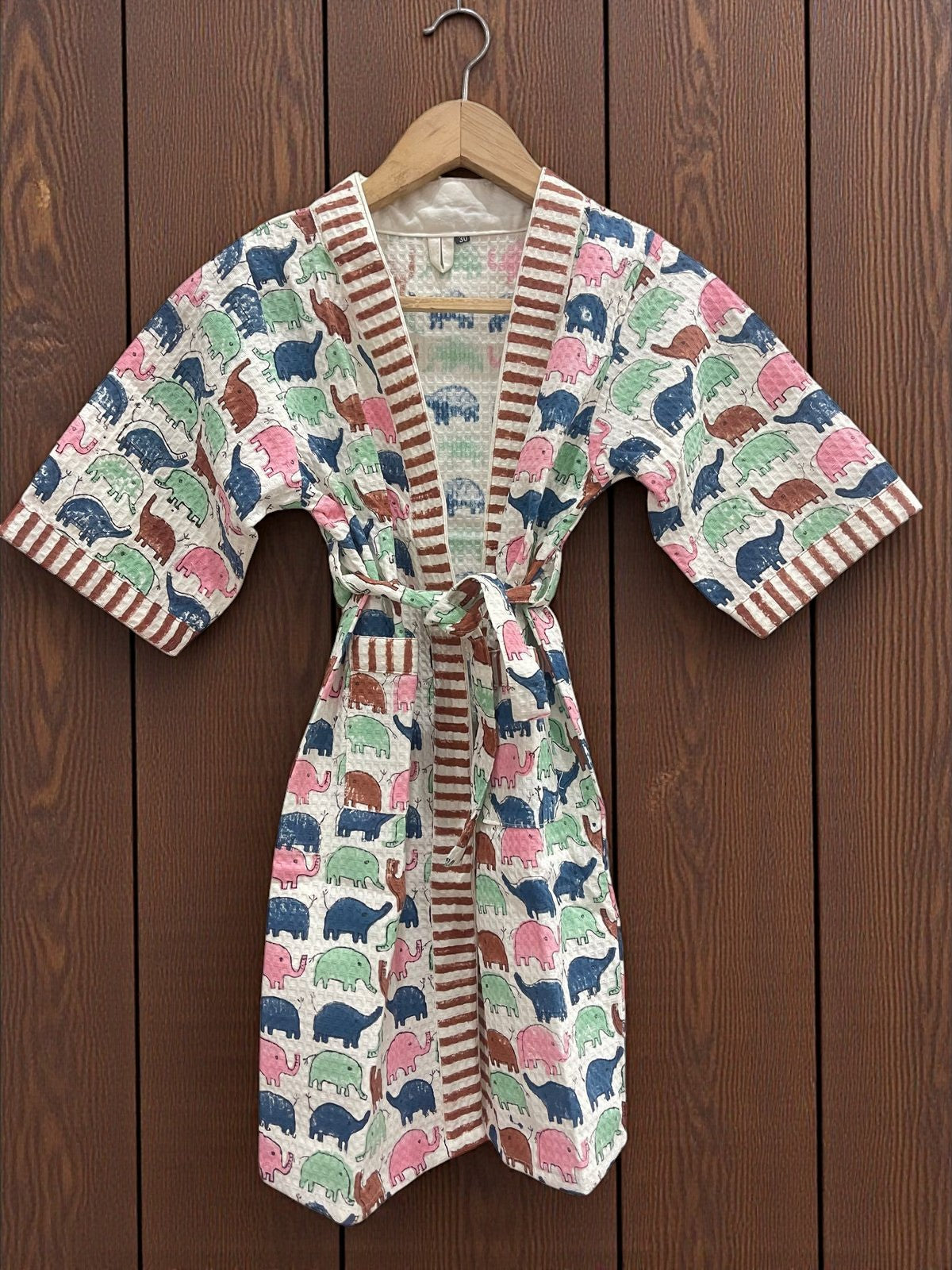 Hand Block Waffle Cotton Kids Bathrobe (Elephant Print)