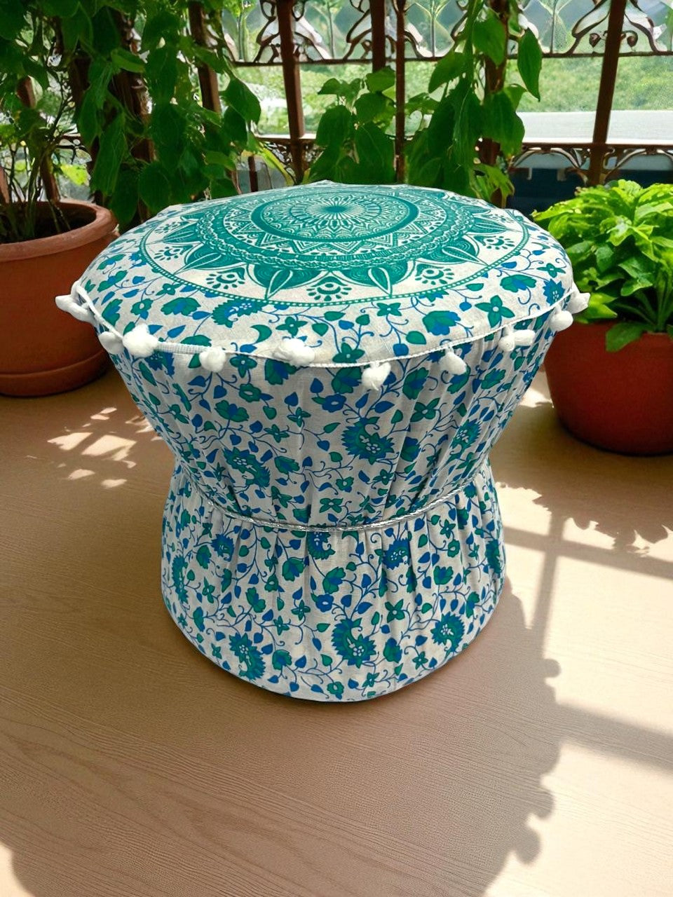 Add a burst of vibrant culture to your home with this stunning set of 2 handcrafted Rajasthani stools / Ottoman/ Mudda Covers. Inspired by the traditional design, these covers are adorned with colorful folk art, tribal dance motifs, and intricate patterns in bright hues. The cotton fabric cover is detailed with tassels , making each piece a celebration of Indian craftsmanship.