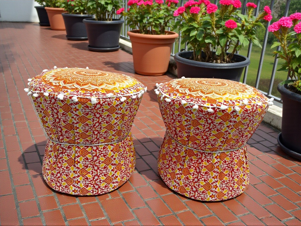 Add a burst of vibrant culture to your home with this stunning set of 2 handcrafted Rajasthani stools / Ottoman/ Mudda Covers. Inspired by the traditional design, these covers are adorned with colorful folk art, tribal dance motifs, and intricate patterns in bright hues. The cotton fabric cover is detailed with tassels , making each piece a celebration of Indian craftsmanship.